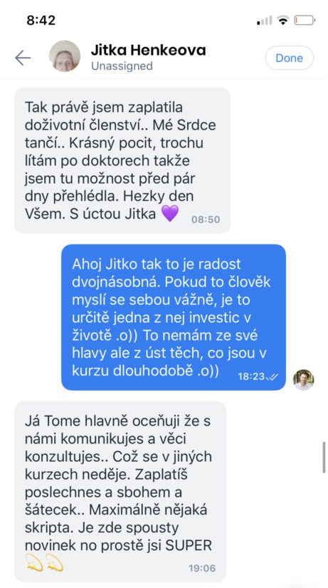 Milý Tomáši, z celého srdce děkuji za propracovaný kurs. Potkala jsem ho v těžkých chvílích svého života a dodal mi energii (vítr do plachet) i jasný cíl. Tvá videa jsou inspirativní a zábavná. A v meditacích jsi dokázal obejít můj silně vyvinutý sval - mozek, který se snažil mít nade mnou navrch. 🙂 Mohu jen doporučit!!!